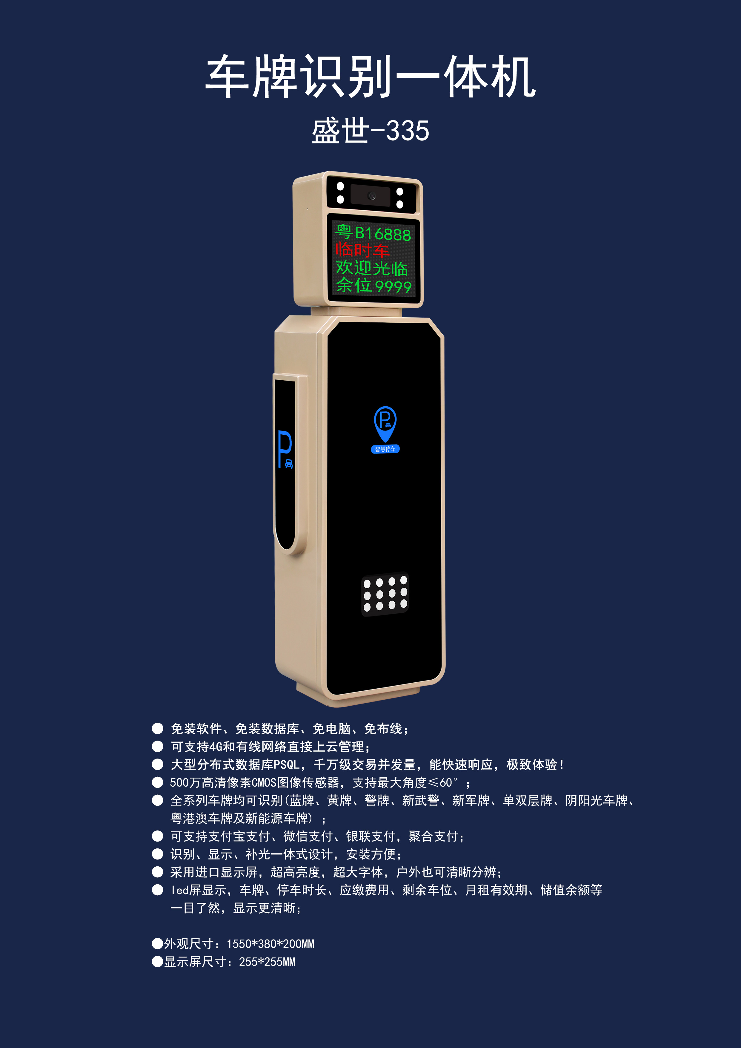LCD高清屏顯示,車牌、停車時長、應繳費用、剩余車位、月租有效期、儲值余額等一目了然,紅綠色字體區分顯示,顯示更清晰 ;